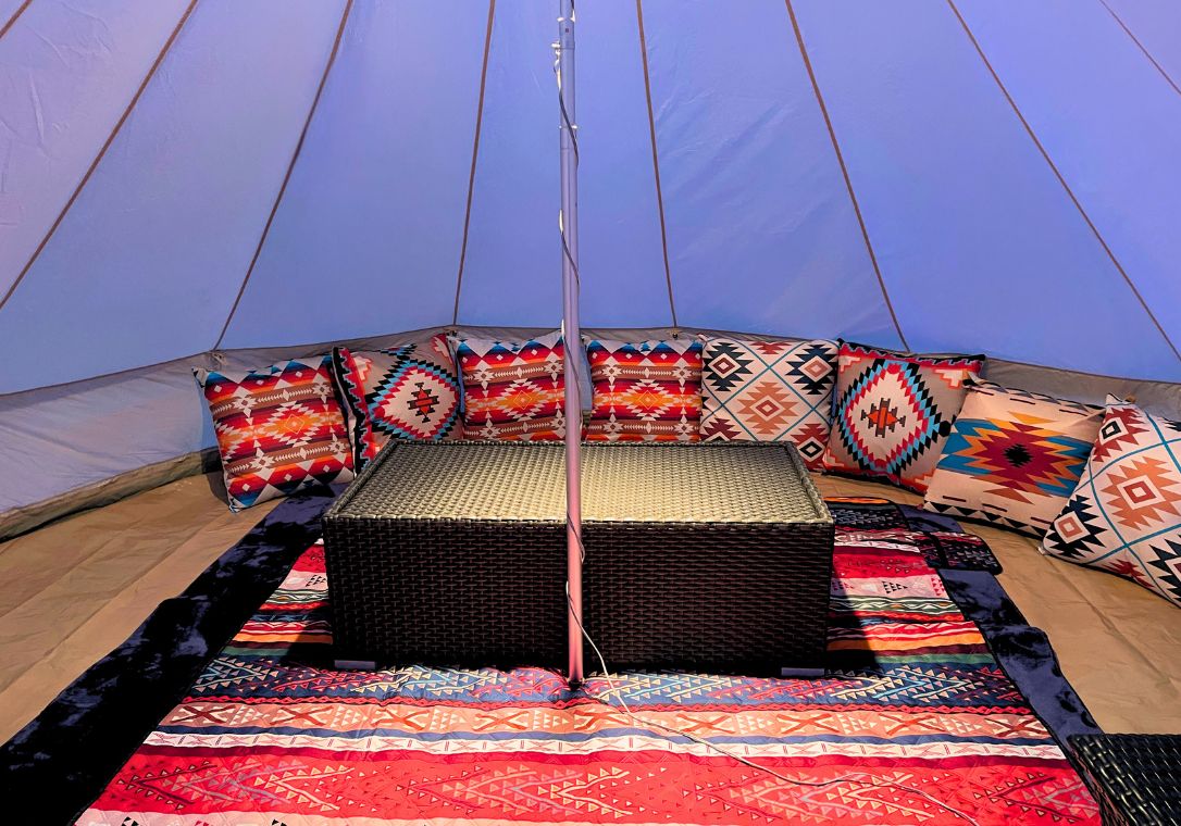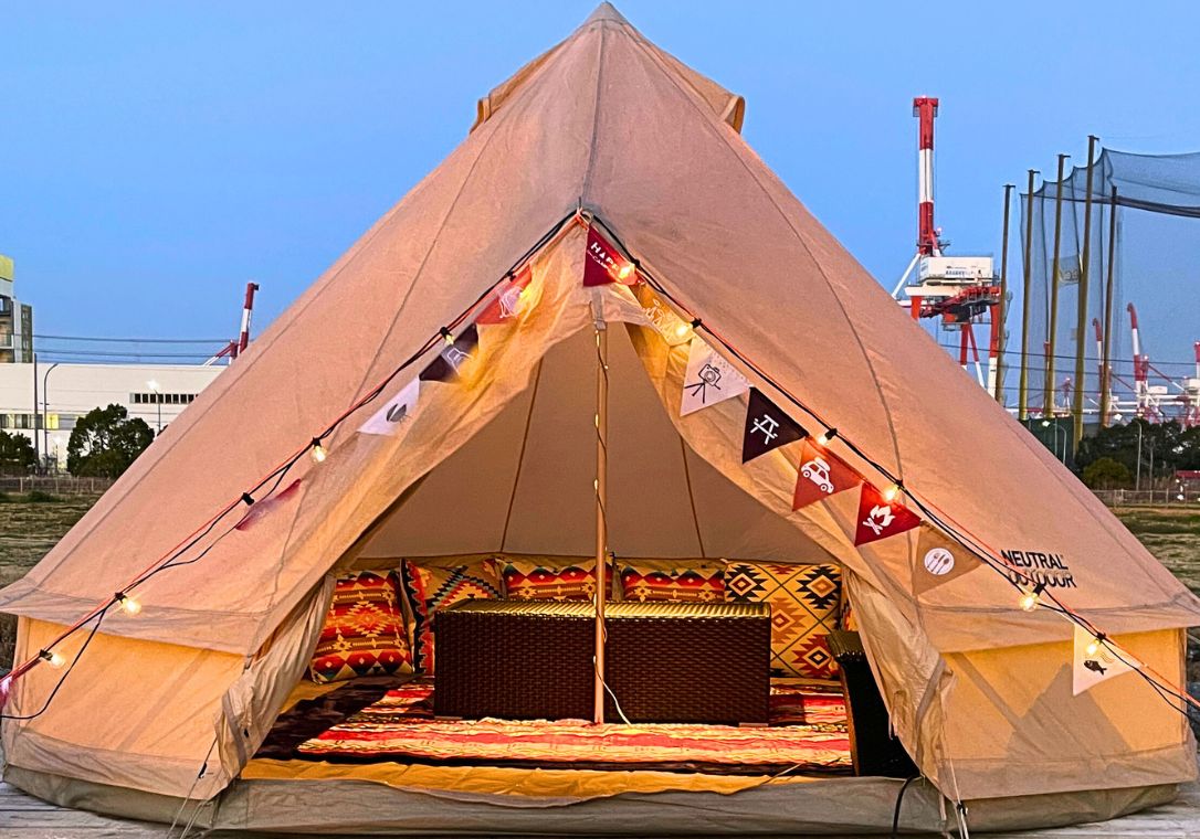 ベル型テントを設置した開放的なキャンプエリアです。ローチェアとローテーブルでくつろぎながら、アメリカンガスグリルで本格BBQを気軽にお楽しみいただけます。