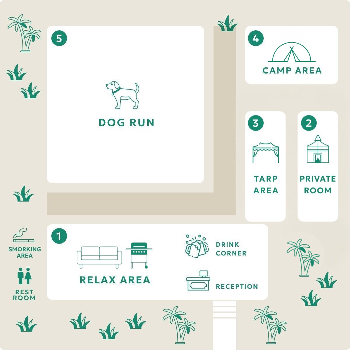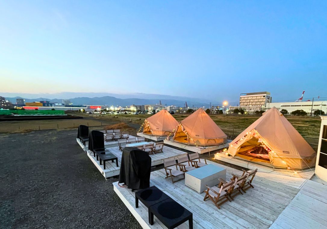 - リラックスエリア、個室エリアはご利用可能です。タープ、キャンプエリアは風雨が強い場合はご利用できません。なお、台風等、荒天の場合は営業中止となります。HPでお知らせします