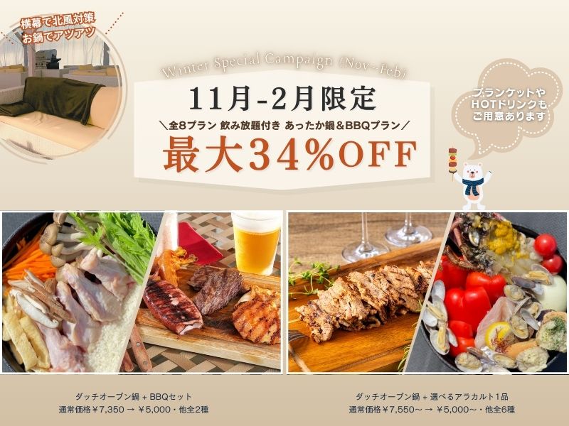 延長決定📢【11月-2月限定】最大34%OFF!リゾート気分で味わうダッチオーブン鍋×手ぶらBBQプラン🍲